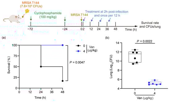 Female BALB/c mice (n = 6 per group, 18–20 g) were intranasally inoculated with MRSA T144 at a dose of 7.8 × 108 CFUs per mouse in a 20 µL volume. Two hours post-infection, mice received an intranasal dose of vancomycin (4 µg/kg) in a 20 µL volume per mouse. A second dose was administered 12 h post-infection, followed by additional doses every 12 h, for a total of four doses. During the treatment period, survival rates were recorded, and bacterial loads in deceased mice were quantified. At 48 h post-infection, surviving mice were humanely euthanized, and their lungs were collected to determine the bacterial load.