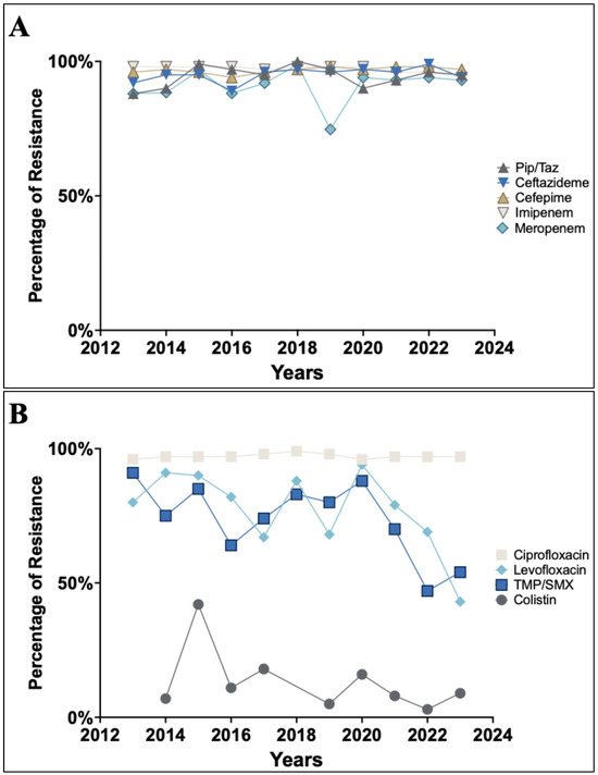 Upon analyzing the resistance rates from the beginning and the final two years of the study, it was observed that the years 2013 and 2014 exhibited significantly higher rates compared to the last two years, 2022 and 2023, for levofloxacin, TMP/SMX, and aminoglycosides. However, this was not the case for the other antibiotics such as beta-lactams, colistin, and ciprofloxacin, as illustrated in Figure 3D.