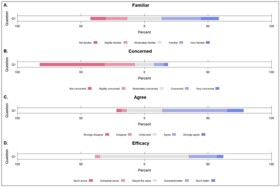 Beef cattle farmers’ responses to questions on their knowledge and attitudes on antimicrobial resistance and antimicrobial use, Illinois, United States. (A). How familiar are you with the topic of antibiotic resistance? (B). Are you concerned about cattle infections with antibiotic-resistant bacteria on your farm? (C). Do you agree that inappropriate antimicrobial use can contribute to the development of antibiotic-resistant bacteria on your farm? (D). How do you think antibiotic drugs are working on your farm today compared to 5 years ago?