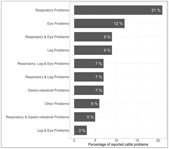 The largest proportion of farms used antimicrobials to treat respiratory problems (21%), followed by eye problems (12%), leg problems (9%), and gastrointestinal problems (7%). Also, antimicrobials were used for multiple conditions to treat respiratory and leg problems (9%), respiratory and eye problems (7%), and respiratory, eye, and leg problems (7%) (Figure 2).