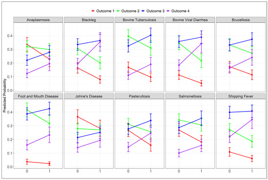 For most cattle diseases, beef producers who had their farms’ biosecurity evaluated had a higher predicted probability for the top two outcome categories (category 3— knowing some basics and 4—being knowledgeable about a disease). On the other hand, a higher probability was observed for the two lower outcome categories (Outcomes 1—never heard of it; 2— recognize the name of a disease) for producers who did not conduct a farm biosecurity evaluation on their farm.