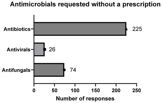Types of antimicrobials requested without prescription. Pharmacists’ responses to patients’ requests for antimicrobials without prescription. Query was, “What types of antimicrobials are most frequently requested without a prescription? (Select all that apply)”.