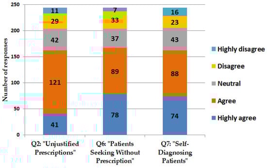 Pharmacists’ responses regarding prescribing antimicrobials without formal prescriptions. Figure presents responses provided by pharmacists regarding their interactions with patients who request antimicrobials without prescriptions in Jordan. Questions encompassed: Q2: “I frequently receive prescriptions for antimicrobials without proper justification or diagnosis.” Q6: “I frequently encounter patients seeking to purchase antimicrobials without a prescription.” Q7: “I frequently encounter patients who self-diagnose and request specific antimicrobials without a prescription”.