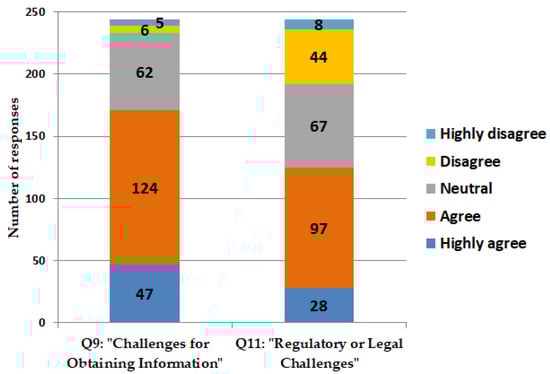 Challenges encountered by scientists in prescribing antimicrobials. Enquiries are delineated as follows: Q9: “I frequently encounter challenges in obtaining relevant patient information necessary for assessing the appropriateness of antimicrobial prescriptions.” Q11: “I frequently encounter regulatory or legal challenges when I refuse to provide antimicrobials to patients seeking to purchase them without a prescription”.