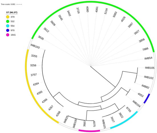 To construct the phylogeny, reference strains of P. aeruginosa sequence types ST379, ST532, ST554, ST970, and ST1641 from the PubMLST database, along with those obtained during this study, were used. The GrapeTree tool [56] and MLST gene sequences were used to build the tree. The nearest neighbour algorithm was applied to calculate the phylogeny.