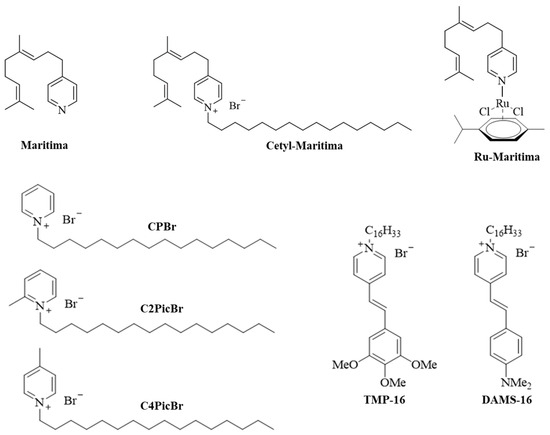 To assess the potential of Cetyl-Maritima as an antifungal agent, further known N-cetylpyridinium derivatives were tested in the M. mycetomatis model. These include two N-cetylpicolinium derivatives (C4PicBr and C2PicBr) and two N-cetylstilbazolium derivatives (TMP-16 and DAMS-16). However, these cetylpyridinium compounds were also less active (IC50 = 16.0–18.2 μM) against M. mycetomatis than Cetyl-Maritima, which underscores the notable antifungal activity of the new Maritima derivative. The structures of the test compounds used for antifungal evaluation are shown in Figure 2.