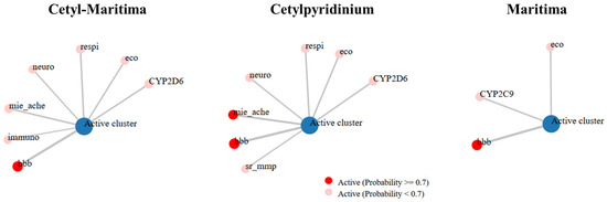Cetyl-Maritima is likely to cross the blood–brain barrier, which was also predicted for Maritima and cetylpyridinium (with probabilities of >0.9). For all three compounds, ecotoxicity was also predicted, albeit with lower probability (<0.7). But in total, the toxicity profile of Cetyl-Maritima was more similar to the profile of cetylpyridinium than to the profile of Maritima. The latter was predicted to be inactive against more relevant targets and mechanisms than both pyridinium compounds (Tables S1–S3). In contrast to Maritima, Cetyl-Maritima and cetylpyridinium showed certain probabilities of neurotoxicity (0.58–0.59) and respiratory toxicity (0.64–0.66). In addition, acetylcholinesterase was predicted to be a target for cetylpyridinium (0.82) and with lower probability for Cetyl-Maritima (0.67). Both compounds differed in terms of immunotoxicity (only for Cetyl-Maritima) and effects on mitochondrial membrane potentials as stress response (only for cetylpyridinium). Two metabolic targets were found with low probabilities (<0.7), CYP2C9 for Maritima and CYP2D6 for Cetyl-Maritima and cetylpyridinium. The predicted activity clusters of the compounds are shown in Figure 3.