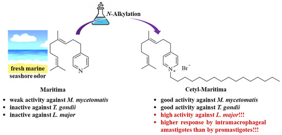 Maritima, Cetyl-Maritima, and their biological activities disclosed in this study. The odoriphore Maritima was used as starting compound for the alkylation reaction furnishing Cetyl-Maritima. Maritima was only weakly active against M. mycetomatis fungi and inactive against T. gondii and L. major parasites. N-Alkylation to Cetyl-Maritima led to significantly increased activities against M. mycetomatis, T. gondii, and L. major. Notably, Cetyl-Maritima was highly active against L. major parasites, especially against intramacrophageal amastigotes.