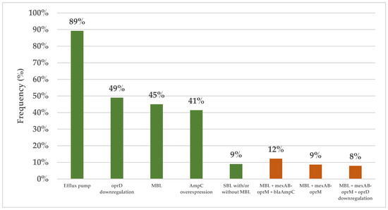 The prevalence of different resistance mechanisms in the CRPA isolates. The green and orange bars represent the frequencies of the individual resistance mechanisms and multiple distinct resistance mechanisms, respectively. Efflux pumps: At least one of mexAB-oprM, mexCD-oprJ, mexEF-oprN, or and mexXY-oprM. Abbreviations: CRPA, carbapenem-resistant Pseudomonas aeruginosa; MBL, metallo β-lactamase; SBL, serine β-lactamase.