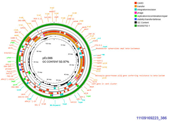 Genomic circular map of pEc386, allocated into Incl1-IA, accommodating blaCTXM-1. The predicted resistance genes are highlighted in red, the GC content is indicated in black, and the bacterial mobile genetic elements (MGEs) are represented in the colors shown in the legend. Outer track (in green) represents the sequence similarity BLAST to its closest related MG692702.1.