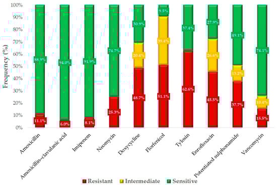 - Brian, V.L. VET01SEd5; Performance Standards for Antimicrobial Disk and Dilution Susceptibility Tests for Bacteria Isolated From Animals. 5th ed. The Clinical and Laboratory Standards Institute: Wayne, PA, USA, 2024. Available online: https://clsi.org/standards/products/veterinary-medicine/documents/vet01s/ (accessed on 8 May 2022).