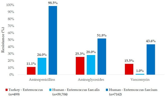 - Torres, C.; Alonso, C.A.; Ruiz-Ripa, L.; León-Sampedro, R.; Del Campo, R.; Coque, T.M. Antimicrobial Resistance in Enterococcus spp. of Animal Origin. Microbiol. Spectr. 2018, 6. [Google Scholar] [CrossRef]