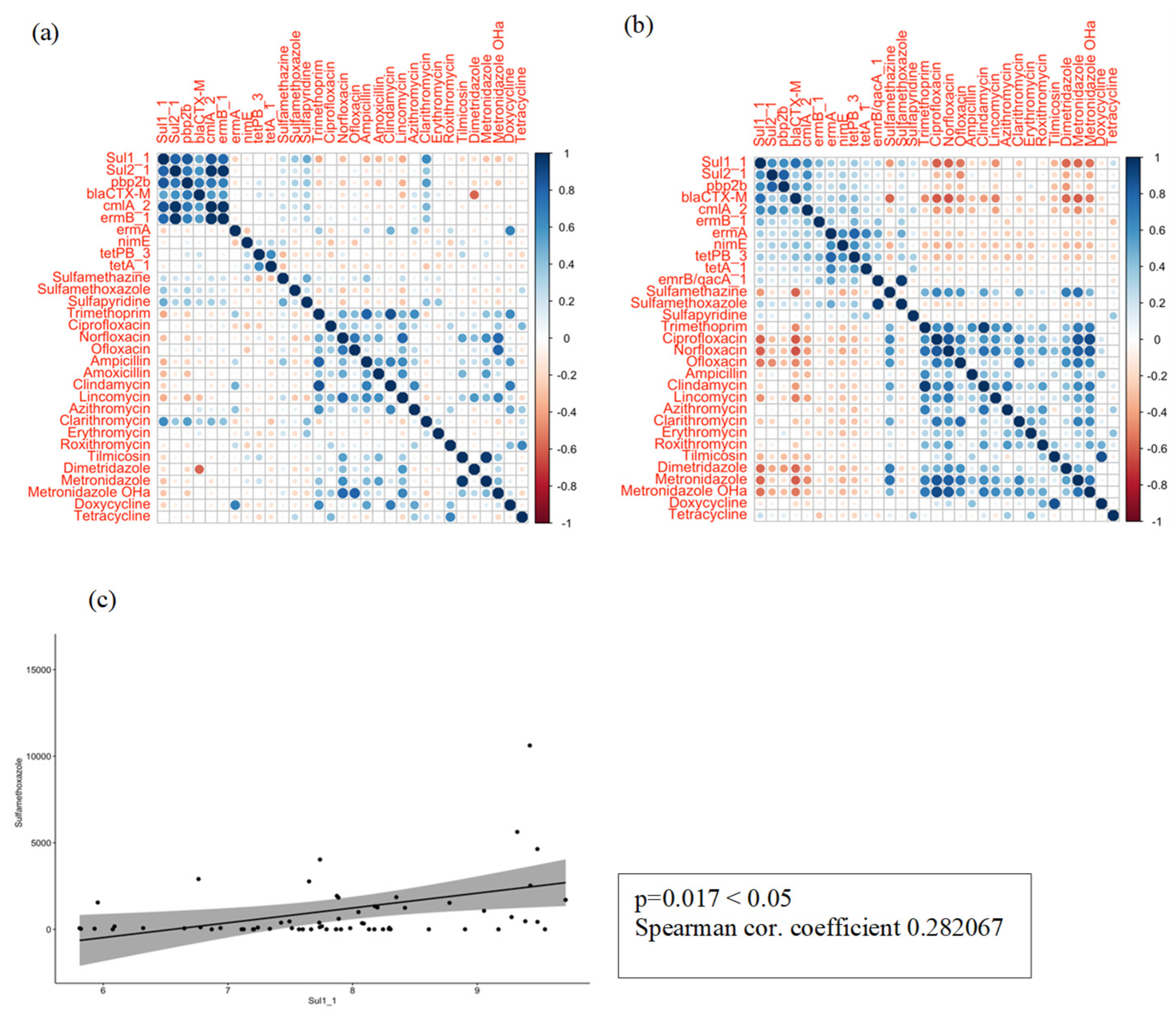 Correlations between ARGs and (a) influent (b) effluents and (c) example of linear correlation between ARGs and antibiotics.