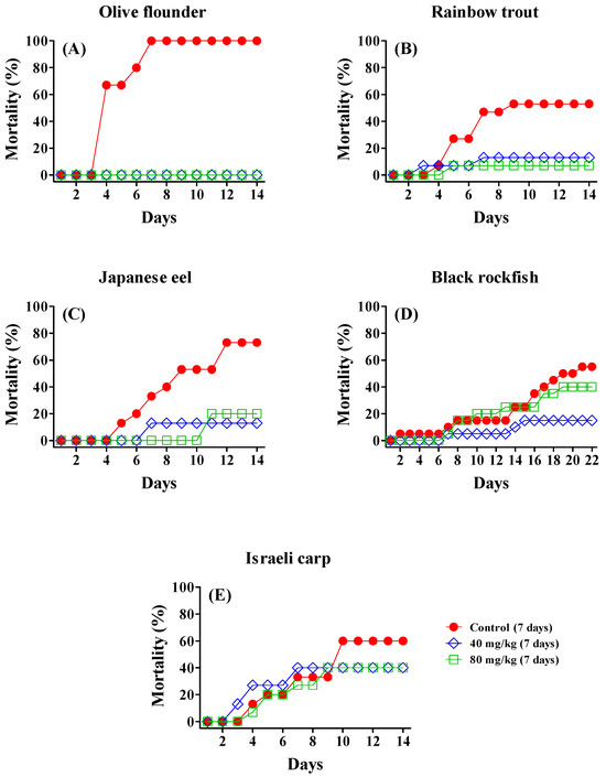 Effect of AMOX on cumulative mortality in fish artificially infected with bacterial pathogens. Fish were artificially infected with bacterial pathogens and subsequently administered AMOX orally for seven consecutive days. Cumulative mortality was monitored daily for up to 22 days post-infection. Each panel illustrates the cumulative mortality for a specific fish species: (A) olive flounder (n = 15), (B) rainbow trout (n = 15), (C) Japanese eel (n = 15), (D) black rockfish (n = 20), and (E) Israeli carp (n = 15).