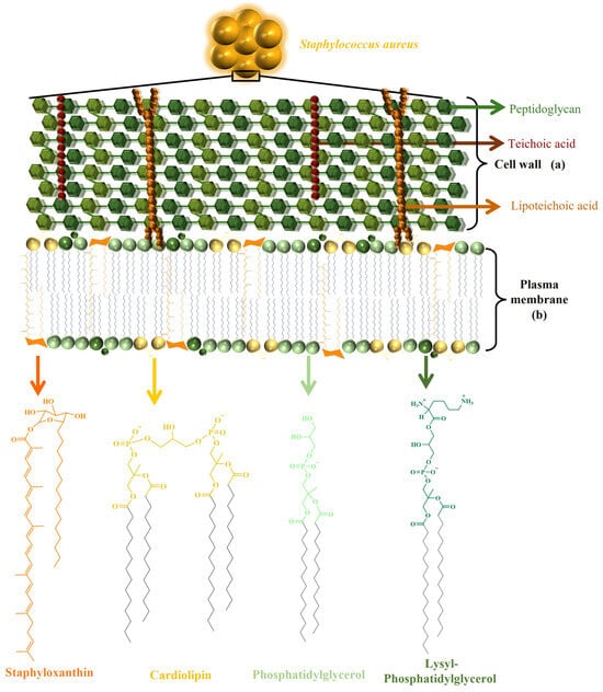 Structural model of S. aureus membrane. (a) Representation of the cell wall, including peptidoglycan, teichoic acid, lipoteichoic acid, and (b) the plasma membrane, illustrating the distribution of key phospholipids, such as PG, lysyl-PG, and CL, along with the carotenoid pigment STX and their structures.
