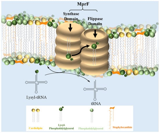 MprF, a crucial virulence factor in S. aureus, plays a key role in resistance and directly contributes to pathogenicity. This bifunctional enzyme operates via two distinct domains: the synthetase domain, which catalyzes the addition of lysine to PG to produce lysyl-PG, and the flippase domain, which translocates lysyl-PG to the outer membrane monolayer [20,73]. First, in the synthetase domain, the biosynthesis of lysyl-PG depends on aaPGSs, which transfers amino acids from aminoacyl-tRNAs to the polar headgroup of PG (Figure 2). Once synthesized, the lysyl-PG is then translocated to the outer membrane through the flippase domain, completing the modification process. The flippase domain is equally critical, as it fully activates lysyl-PG’s resistance function by translocating it to the outer membrane monolayer. Located at the N-terminus of MprF, this domain consists of multiple transmembrane segments that transport lysyl-PG from the inner to the outer membrane monolayer. Although the precise molecular mechanism is still under investigation, it is believed to rely on an energy-dependent process, possibly driven by the proton motive force, since this domain lacks ATP-binding motifs [75]. Mutations in this domain, especially those linked to daptomycin resistance, highlight its role in cAMP resistance and MprF-mediated virulence [103]. Slavetinsky et al. (2012) further demonstrated that MprF flippases can efficiently translocate both lysyl-PG and alanyl-PG. However, the synthesis and translocation of lysyl-PG conferred a significantly higher level of resistance to cationic antimicrobial peptides (cAMPs) and daptomycin compared to alanyl-PG. This finding highlights the critical role of MprF not only in modifying the bacterial membrane composition but also as an essential virulence factor in Staphylococcus aureus. This study also reveals that the flippase domains of MprF exhibit broad substrate specificity, enabling the efficient translocation of both lipid forms. Understanding this substrate specificity could aid in developing targeted inhibitors that disrupt MprF’s flippase activity, potentially compromising multiple resistance mechanisms simultaneously. Furthermore, it underscores the importance of considering the overall lipid composition of the membrane, which plays a key role in influencing antimicrobial resistance [104].