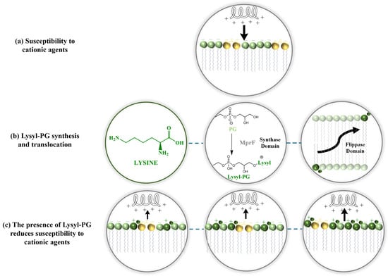 The biosynthesis of lysyl-PG occurs in the luminal face of the membrane. The dual-domain structure of MprF facilitates both lysyl-PG synthesis and translocation towards the outer monolayer, which is essential for infection persistence. According to the study by Ernst et al., these domains work together to reduce the net negative charge of the outer leaflet of the bacterial membrane. Mutations disrupting either the lysyl-PG synthesis or translocation domain led to a significant decrease in resistance to cAMPs, underscoring the necessity of both functions for effective immune evasion. Interestingly, this study also demonstrated that while these protein domains are functionally complementary, they do not need to be covalently linked to perform their roles effectively [20]. MprF-mediated charge modulation has become a focal point in the study of bacterial resistance mechanisms, particularly in Gram-positive pathogens such as S. aureus. This review traces the study and characterization of lysyl-PG and its relationship with antimicrobial resistance in S. aureus and other bacteria and discusses the influence of the modified lipid on membrane charge and antimicrobial peptide and antibiotic interactions. The objective of this study was to provide a global understanding of how lysyl-PG biosynthesis contributes to membrane resistance and to outline its potential as a target for antimicrobial therapeutics.
