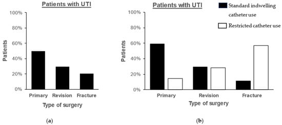 Type of surgery of patients with urinary tract infection (UTI; n = 34) in (a) the entire study period and (b) in the year before and after changes in hospital guidelines.