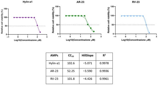 Dose–response curves for the AMPs against HaCaT cell line and CC50 (reported in μM), HillSlope, and R2 values were obtained by the fitting of the curves. The viability effect of Hylin-a1, AR-23, and RV-23 was analyzed on HaCaT cells. The cell monolayer was treated with serial dilutions of peptides for 20 h. Untreated cells were used as a positive control, while dimethyl sulfoxide (DMSO) was used as a negative control. HillSlope: The measure of the steepness of the dose–response curve. A positive value indicates a cooperative response, while a negative value suggests an inhibitory effect. R2 (coefficient of determination) indicates how well the model fits the data. Ranges from 0 to 1, with 1 representing a perfect fit. Higher R2 values suggest a more accurate prediction of the biological response to varying concentrations [46].