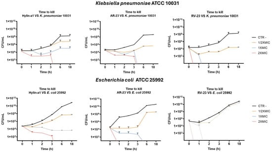 Evaluation of the kinetic-killing effect of Hylin-a1, AR-23, and RV-23 against K. pneumoniae and E. coli. 2× MIC, 1× MIC, and 1/2 MIC were tested for each peptide in a range of time from 0 to 18 h. Untreated bacteria was used as control negative (CTR- in black).