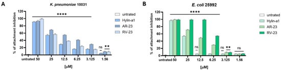 The effect of Hylin-a1, AR-23, and RV-23 on the initial cell attachment of biofilm formation. (A) K. pneumoniae ATCC 10031, (B) E. coli ATCC 25992. The bacterial suspension was exposed on the surface together with peptides (50–1.56 μM), and, after 2 h, the non-adherent cells were removed while adherent cells were quantified by CV staining by reading absorbance at 570 nm. Statistical analysis was performed by One-way ANOVA followed by Dunnett’s multiple comparisons test. Significances are referred to the untreated sample. **** p < 0.0001; ** p = 0.0059; ns: non-significant.
