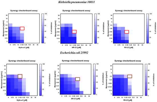 Evaluation of the synergism between peptides and meropenem using a checkerboard assay [47]. The rows contain two-fold dilutions of meropenem, while we reported a two-fold serial dilution of AMPs in the columns. The data are expressed as a percentage of inhibition of bacteria growth, while the red square indicates synergism with the lowest FICI.