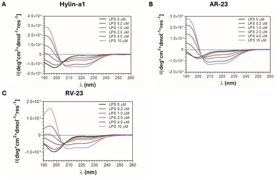 The overlay of representative CD spectra for Hylin-a1 (A), AR-23 (B), and RV-23 (C) is presented, showing their profiles at a concentration of 50 μM and in the presence of an increasing amount of LPS, ranging from 0.2 to 10 μM, in 5 mM sodium phosphate buffer at pH 7.4. CD spectra were recorded from 190 to 260 nm using a JASCO J-705 CD spectrophotometer at a controlled temperature of 25 °C (for further details, see Section 4). The spectra were adjusted by subtracting the respective background signals. Graphical representations were generated using GraphPad Prism 5.1 software (GraphPad Software, San Diego, CA, USA).