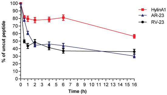 The susceptibility of Hylin-a1, AR-23, and RV-23 to proteolytic degradation in serum was evaluated, following the protocol reported in Section 4.3.