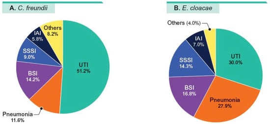 Citrobacter freundii species complex (CFC) and Enterobacter cloacae species complex (ECLC) have become relevant among the organisms causing healthcare-associated infections (HAI) due to their ability to develop antimicrobial resistance [1,2]. These organisms are opportunistic pathogens that are responsible for various HAI, including pneumonia, bloodstream infections (BSIs), meningitis, urinary tract infections (UTIs), and skin and skin structure infections (SSSIs). These organisms have also been frequently implicated in hospital outbreaks, especially in neonatal units [3,4,5].