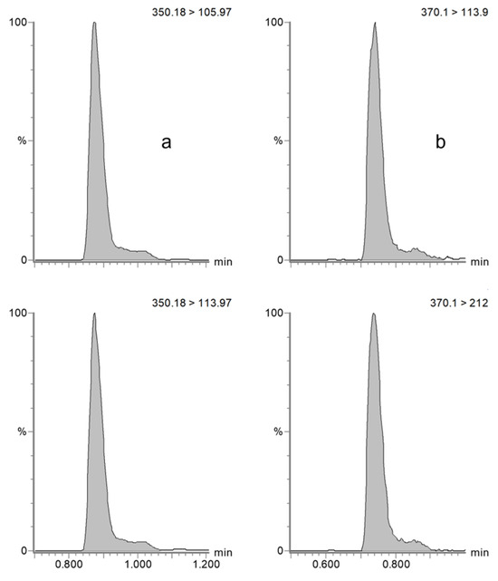 Chromatograms obtained from the MRM analysis of ampicillin (a) and the internal standard amoxicillin-d4 (b) in a horse plasma sample.