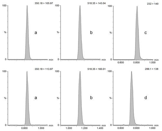 Chromatograms obtained from the MRM analysis of ampicillin (a), piperacillin (b), sulbactam (c), and tazobactam (d) in dog serum samples.