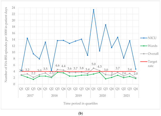 (a) Quarterly EO-BSI rate per 1000 live births (2017–2021). EO-BSI, early onset bloodstream infection. (b) Quarterly HA-BSI rate per 1000 in-patient days, stratified by neonatal unit location (2017–2021). EO-BSI, early-onset bloodstream infection. HA-BSI, healthcare-associated bloodstream infection; NICU, neonatal intensive care unit.