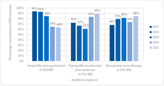 Concordance of BSI episodes with different empiric antibiotic regimens. EO-BSI, early onset bloodstream infection; HA-BSI, hospital-associated bloodstream infection.