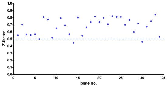 Z-factor plot from high-throughput screening performed in 96-well plates. Solid dots represent the Z-factor from thirty-four 96-well plates. The dashed line indicates a threshold of 0.5.