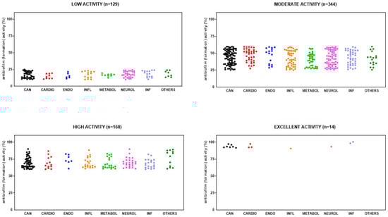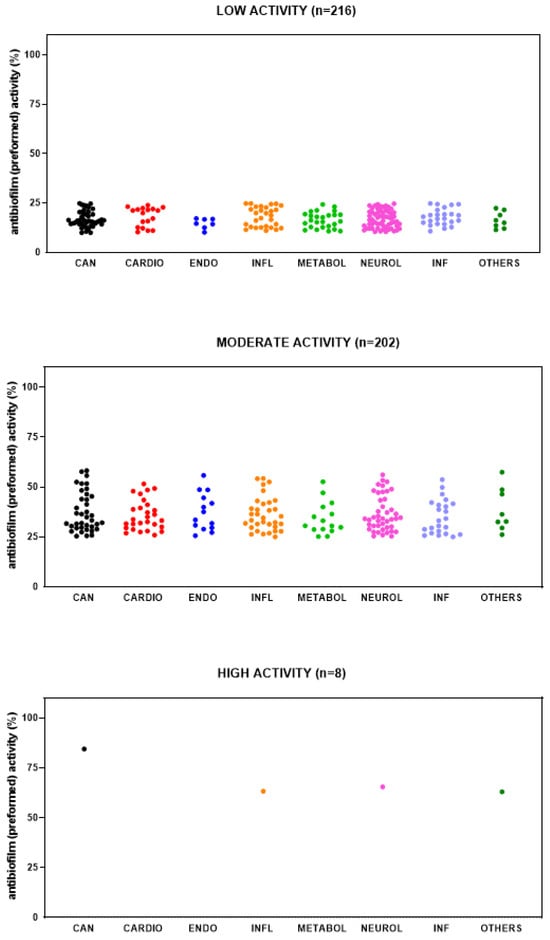 HTS of the compound library to identify active hits against preformed biofilm by S. aureus Sa2 strain. The antibiofilm activity of compounds in several research areas (CAN, cancer; CARDIO, cardiovascular; ENDO, endocrinology; INFL, inflammation; METABOL, metabolic disease; NEUROL, neurological disease; INF, infection; OTHERS, various research areas) is shown as a percentage referred to as the untreated control. The magnitude of the antibiofilm activity is categorized as follows: low (i.e., 10% < biofilm reduction < 25%), moderate (i.e., 25% ≤ biofilm reduction < 60%), high (i.e., 60% ≤ biofilm reduction < 90%), and excellent (i.e., biofilm reduction ≥ 90%).