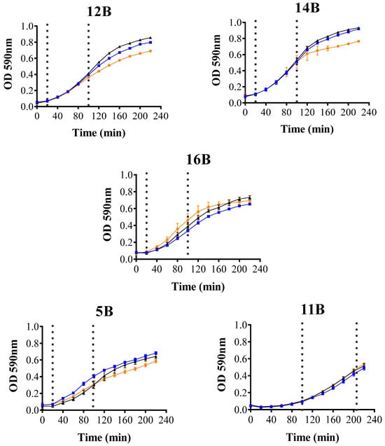Growth curves of CTX-M-type ESBL-producing E. coli strains exposed to sub-inhibitory doses of Melittin. Doses: 0 (●), 1/2 MIC (▲), and 1/4 MIC (■) µg/mL of Melittin. The culture was performed in triplicate. Error bars represent the variability across the three replicates. The dashed lines indicate the start and end of the average logarithmic phase.