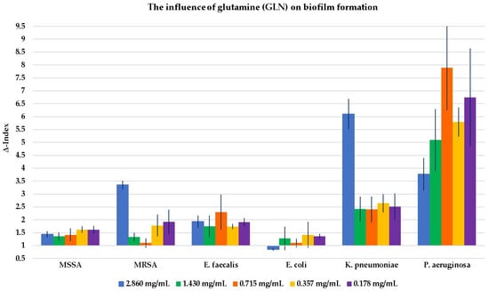3.3. Key Aspects of Glutamic Acid (GLA) and the Glutamine (GLN) Effect on Bacterial Growth and Biofilm Formation