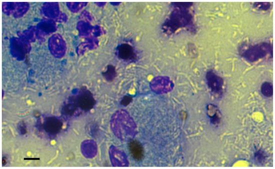 The FNA cytology revealed the presence of numerous negatively stained bacilli, both within and outside the immune cells, lymphocytes, and macrophages. The May–Grünwald–Giemsa stain was utilised for the examination. Bar, 10 µm.