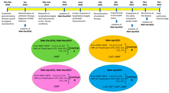 The chronological overview of the most significant events, as well as the various genotypes and phenotypes of Mah isolates. The Mah isolates grouped into four clusters, according to drug susceptibility phenotypes and genotypes. The resistance (R) to EMB (ethambutol), CLA (clarithromycin), RIF (rifampicin), and DOX (doxycycline) are shown.