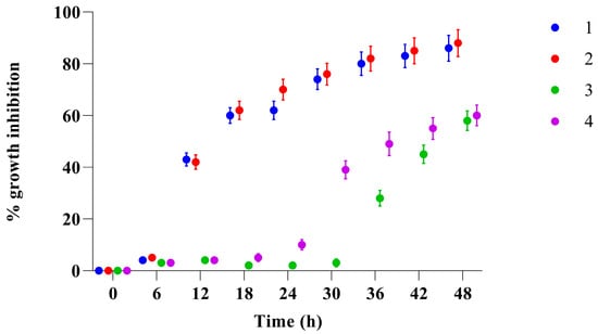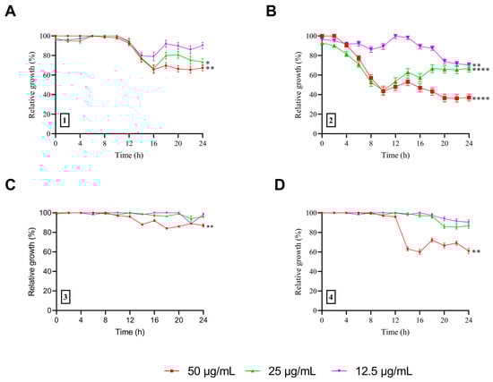 4 (panel D) at the highest concentration (50 µg/mL) reduces growth by about 40%. These results, taken together, show fungistatic activity within 24 h at concentrations up to 50 µg/mL. The minimum inhibitory concentrations of compounds