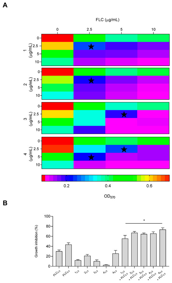 4.5. FICI Index Determination for Compounds 1–4 and Fluconazole