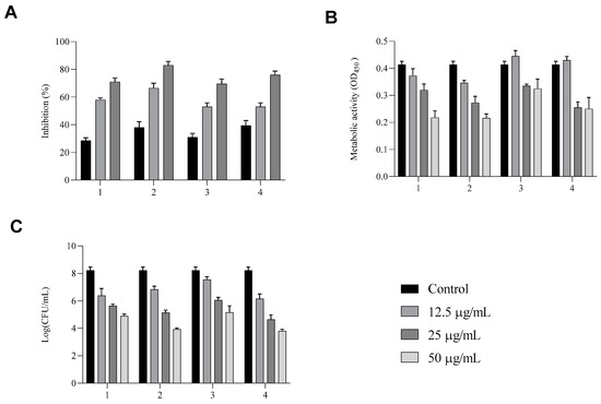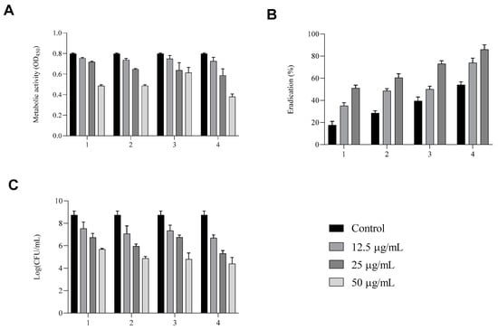 4 were then introduced at the same sub-MIC concentrations (12.5, 25, and 50 μg/mL), and after an additional 24 h of incubation, their biofilm eradication ability was measured as described above. Two independent experiments with six replicates were performed at each concentration for both inhibition and eradication assays and for each detection method.