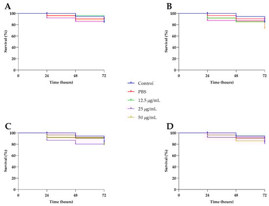 4 (12.5, 25, 50 µg/mL). Plates were then incubated for 72 h at 25 °C without agitation under dark conditions. The survival of nematodes was detected by counting dead worms under a microscope (40 × magnification). Two independent experiments with six replicates were performed at each concentration. Results are shown using the Kaplan–Meier method.
