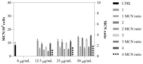 V. faba, with image analysis performed using ImageJ software version 1.53t. The micronucleated cell ratio (MCN ratio) was calculated as the ratio of the number of cells with micronuclei to the total number of cells analyzed. If the MCN ratio exceeds a value of 2, the sample is considered genotoxic.