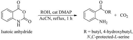 N-carboxyanhydride of 2-aminobenzoic acid. This compound is an activated and readily available commercial form for conducting amide couplings and esterification. The latter was done in the presence of alcohol with 4-dimethylaminopyridine (DMAP) as a catalyst in refluxing acetonitrile for one hour, as illustrated in
