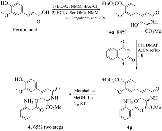 4), incorporating hydroxycinnamic acids, was obtained by conjugating serine methyl ester with ferulic acid through an amide bond, employing a novel sustainable protocol for the chemical derivatization of hydroxycinnamic acids [