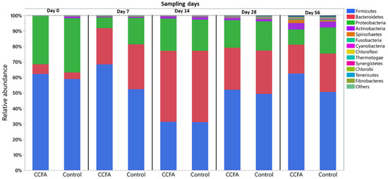Generally, the configuration and diversity of the fecal microbiota at both the phylum and genus levels varied between different time points in both the control and CCFA groups. At the phylum level, Firmicutes (52%), Bacteroidetes (25%), and Proteobacteria (20%) were the most predominant phyla in both the control and CCFA groups (Figure 1). The relative abundance of Firmicutes on day 0 represented 59% and 63% of all microbial populations in the control and CCFA-treated groups, respectively. On day 14, the proportion of Firmicutes decreased to half in favor of increased Bacteroidetes and Proteobacteria in both groups. On day 56, the Firmicutes proportions were restored and became the most abundant phylum, at 50% of the total in the control and 63% in the CCFA-treated group. When comparing the two groups, this increase in Firmicutes on day 56 was only significant (p-value = 0.015) in the CCFA group. Although the other two major phyla showed no significant change between groups at different time points, some minor phyla showed a substantial difference between the control and CCFA groups. These included Actinobacteria (p-value = 0.0008) at day 0, Verrucomicrobia (p-value = 0.046) at both day 0 and 56, Fusobacteria (p-value = 0.035) at day 14, and Chlorobi (p-value = 0.035) at day 28. The other bacterial phyla that averaged less than 0.25% of the total are described in Table S1.