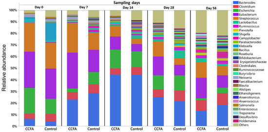 At the genus level, the prevalent bacterial genera that averaged more than 0.25% of the total across all samples were Bacteroides (22.75%), Eubacterium (17.88%), Streptococcus (14.04%), Escherichia (10.93%), Clostridium (7.28%), Lactobacillus (1.86%), Klebsiella (1.76%), and Ruminococcus (1.59%). The distribution of the most abundant bacterial genera in both control and CCFA groups at different time points is illustrated in Figure 2. At all time points, there was a statistically significant decrease in the abundance of specific taxa in the CCFA-treated group compared to the control group. While there were taxa differences between groups at day 0 (Campylobacter (p-value = 0.049), Klebsiella (p-value = 0.045), and low abundance genera (p-value = 0.0117)), the number and identity of the taxa differences increased over time, from three (Klebsiella (p-value = 0.027), Clostridiales (p-value = 0.046), and Salmonella (p-value = 0.036)) on day 7 to six (Ruminococcus (p-value = 0.046), Bacillus (p-value = 0.0357), Erysipelotrichaceae (p-value = 0.0033), Alistipes (p-value = 0.0404), Treponema (p-value = 0.0156), and Holdemania (p-value = 0.0209)) on day 14. On day 28, only Parabacteroides showed a minimal difference between groups (p = 0.046), while no significant differences were observed on day 56. The other bacterial genera that averaged less than 0.25% are summarized in Table S2.