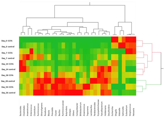 The two-way clustering analysis comparing the predominant genera between the control and the CCFA-treated groups at different time points revealed overlapping clades at days 0, 7, and 14. However, the clustering pattern diminished on day 28 but reappeared on day 56, as shown in the heatmap (Figure 3).