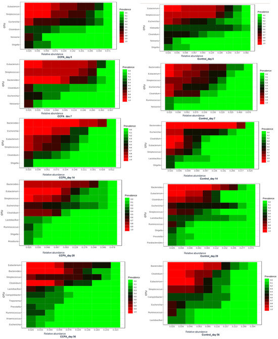 The core microbiome heatmap showed the relative abundance of the richest genera in both control and CCFA-treated groups at each time point (Figure 4). It showed a clearer delay in Ruminococcus and Lactobacillus development in the CCFA-treated group than in the control group. In addition, the CCFA-treated group’s core microbiota encountered an exclusive enrichment of some genera, such as Prevotella, Treponema, and Anaerococcus, on day 56.